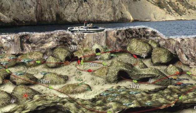 Aparecerán entonces de nuevo las grandes rocas con multitud de oquedades donde se alojan morenas, meros y corvinas. Al llegar a la pared, la podemos dejar a nuestra izquierda y seguir disfrutando de este curioso fondo para, finalmente, al llegar donde hemos fondeado, visitar los otros arcos que a unos ocho metros se encuentran prácticamente frente al que tomamos como inicio de la ruta.